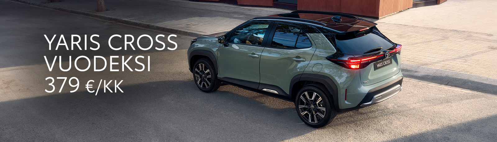 Toyota Yaris Cross 1,5 Hybrid 116 Edition 379 €/kk sis. talvirengasyhdistelmä, metalliväri ja käsittelymaksu 15 €/erä ja perustamiskulu 399 €, käsiraha 0 €, rahoitettava osuus yht. 29765,54 €, 60 kk, korko 1,99 %, MetroAuton sitova ostotarjous sopimuskauden jälkeen. Todellinen vuosikorko 3,32 %. Luotto + luottokustannukset yht. 33111,91 €, vaatii hyväksytyn luottopäätöksen.