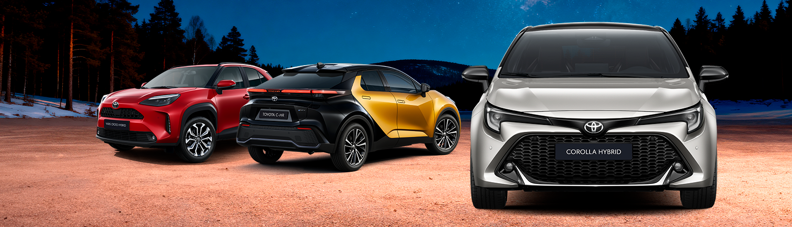Toyota Yaris 1,5 Hybrid 116 Edition 24995,72 €, korko 1,99 %, avaus 399 € ja käsittely 15 €/kk, käsiraha 0 €, osamaksu 24995,72 €, kk-erä 369 €/kk sis. käsittelykulut 15 €/kk, luottoaika 60 kk, viimeinen suurempi erä 12258,51€, luotto+luottokustannukset yht. 28176,68 €, todellinen vuosikorko 3,44 %, vaatii hyväksytyn luottopäätöksen. Toyota C-HR+ Active 77kWh 2WD 45590 €, korko 1,99 %, avaus 499 €, käsittely 19 €/kk, käsiraha 10000 €, osamaksu 35590 €, kk-erä 330,87 €/kk sis. käsittelykulu 19 €/kk, luottoaika 60 kk, viimeinen suurempi erä 20534,50€, luotto+luottokustannukset yht. 40056,11 €, todellinen vuosikorko 3,21 %, vaatii hyväksytyn luottopäätöksen.
